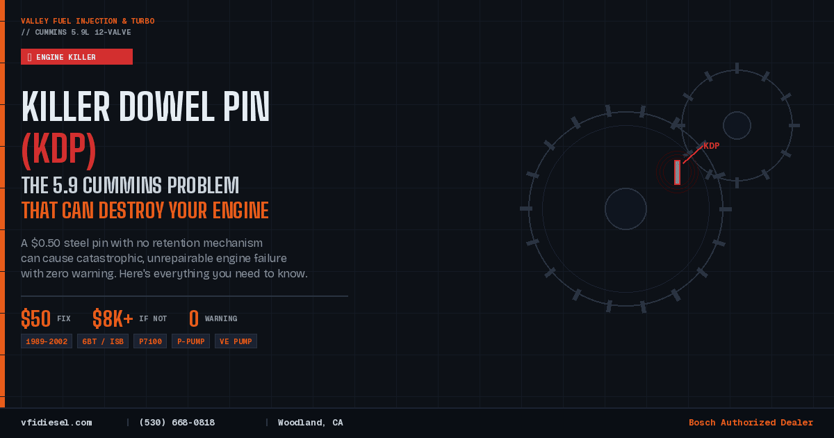 The Killer Dowel Pin is a known design flaw on 1989–2002 5.9L Cummins engines that can cause catastrophic, unrepairable engine failure with no warning. A $50 prevention kit and an afternoon of work eliminates the risk permanently.